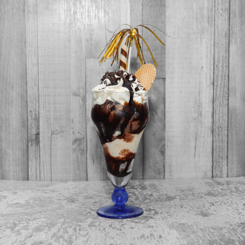 gemischtes Eis mit Schokostreusel, Schokosauce und Sahne